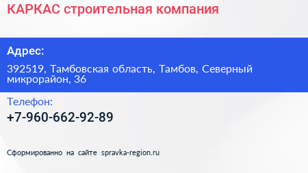КАРКАС, строительная компания по адресу 392519, Тамбовская область, Тамбов, Северный микрорайон, 36 в дальнейшем Организация, размещена в следующих категориях: