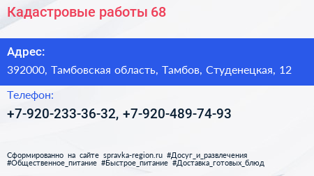 Кадастровые работы 68 по адресу 392000, Тамбовская область, Тамбов, Студенецкая, 12 в дальнейшем Организация, размещена в следующих категориях: