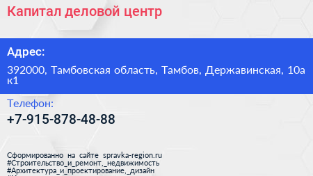 Капитал, деловой центр по адресу 392000, Тамбовская область, Тамбов, Державинская, 10а к1 в дальнейшем Организация, размещена в следующих категориях: