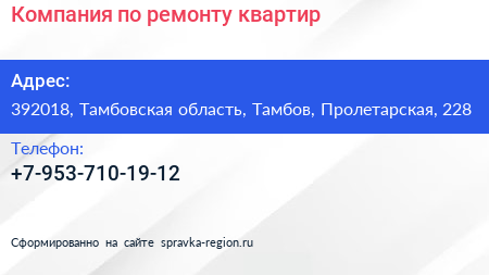 Компания по ремонту квартир по адресу 392018, Тамбовская область, Тамбов, Пролетарская, 228 в дальнейшем Организация, размещена в следующих категориях: