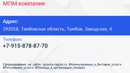 МПМ, компания по адресу 392018, Тамбовская область, Тамбов, Заводская, 4 в дальнейшем Организация, размещена в следующих категориях: