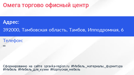Омега, торгово-офисный центр по адресу 392000, Тамбовская область, Тамбов, Ипподромная, 6 в дальнейшем Организация, размещена в следующих категориях: