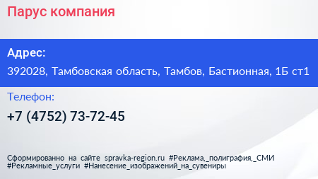 Парус, компания по адресу 392028, Тамбовская область, Тамбов, Бастионная, 1Б ст1 в дальнейшем Организация, размещена в следующих категориях: