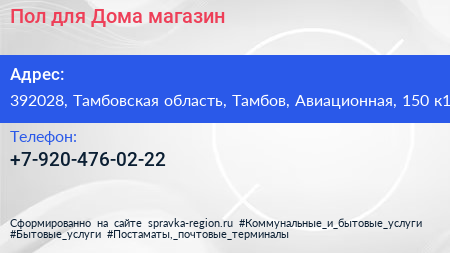 Пол для Дома, магазин по адресу 392028, Тамбовская область, Тамбов, Авиационная, 150 к1 в дальнейшем Организация, размещена в следующих категориях: