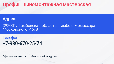 ПрофиL, шиномонтажная мастерская по адресу 392001, Тамбовская область, Тамбов, Комиссара Московского, 46/8 в дальнейшем Организация, размещена в следующих категориях: