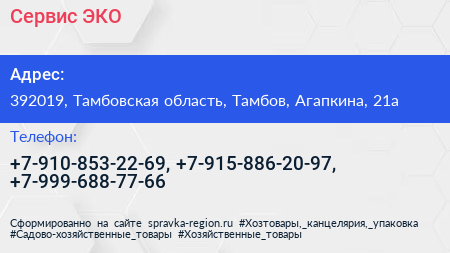 Сервис-ЭКО по адресу 392019, Тамбовская область, Тамбов, Агапкина, 21а в дальнейшем Организация, размещена в следующих категориях: