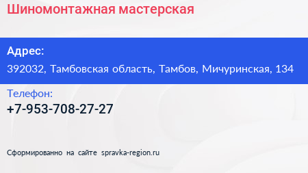 Шиномонтажная мастерская по адресу 392032, Тамбовская область, Тамбов, Мичуринская, 134 в дальнейшем Организация, размещена в следующих категориях: