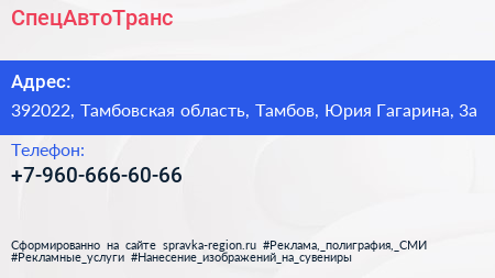 СпецАвтоТранс по адресу 392022, Тамбовская область, Тамбов, Юрия Гагарина, 3а в дальнейшем Организация, размещена в следующих категориях: