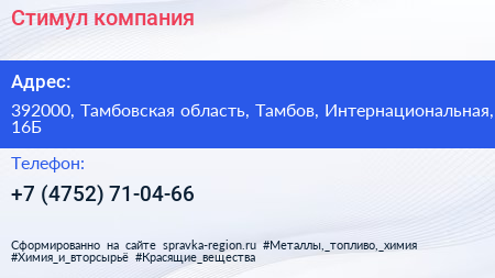 Стимул, компания по адресу 392000, Тамбовская область, Тамбов, Интернациональная, 16Б в дальнейшем Организация, размещена в следующих категориях: