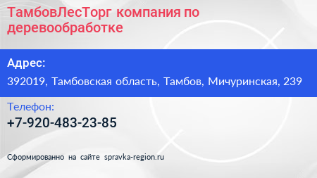 ТамбовЛесТорг, компания по деревообработке по адресу 392019, Тамбовская область, Тамбов, Мичуринская, 239 в дальнейшем Организация, размещена в следующих категориях: