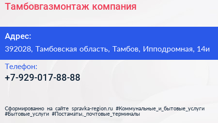 Тамбовгазмонтаж, компания по адресу 392028, Тамбовская область, Тамбов, Ипподромная, 14и в дальнейшем Организация, размещена в следующих категориях: