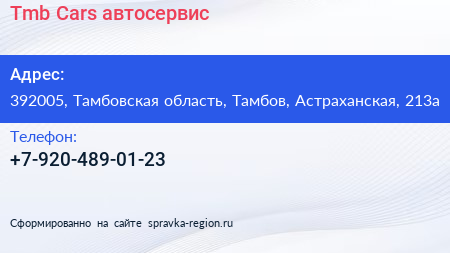 Tmb.Cars, автосервис по адресу 392005, Тамбовская область, Тамбов, Астраханская, 213а в дальнейшем Организация, размещена в следующих категориях: