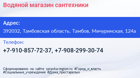 Водяной, магазин сантехники по адресу 392032, Тамбовская область, Тамбов, Мичуринская, 124а в дальнейшем Организация, размещена в следующих категориях: