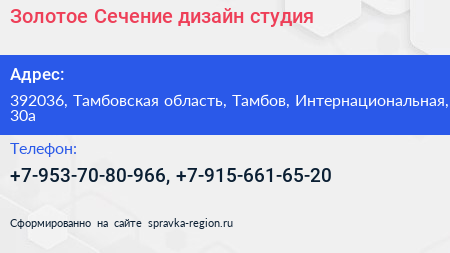Золотое Сечение, дизайн-студия по адресу 392036, Тамбовская область, Тамбов, Интернациональная, 30а в дальнейшем Организация, размещена в следующих категориях: