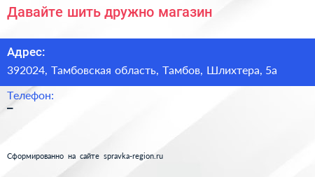 Давайте шить дружно, магазин по адресу 392024, Тамбовская область, Тамбов, Шлихтера, 5а в дальнейшем Организация, размещена в следующих категориях: