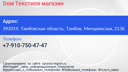 Dом Текстиля, магазин по адресу 392019, Тамбовская область, Тамбов, Мичуринская, 213Б в дальнейшем Организация, размещена в следующих категориях: