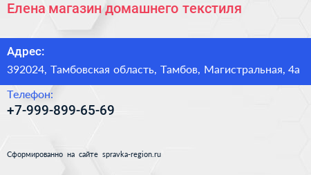 Елена, магазин домашнего текстиля по адресу 392024, Тамбовская область, Тамбов, Магистральная, 4а в дальнейшем Организация, размещена в следующих категориях: