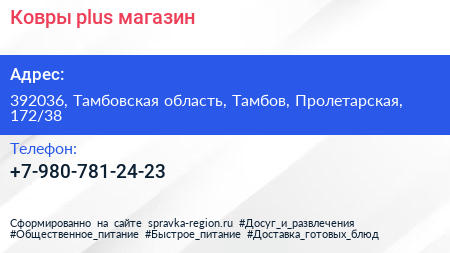 Ковры plus, магазин по адресу 392036, Тамбовская область, Тамбов, Пролетарская, 172/38 в дальнейшем Организация, размещена в следующих категориях: