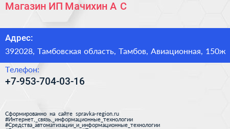 Магазин, ИП Мачихин А.С. по адресу 392028, Тамбовская область, Тамбов, Авиационная, 150ж в дальнейшем Организация, размещена в следующих категориях: