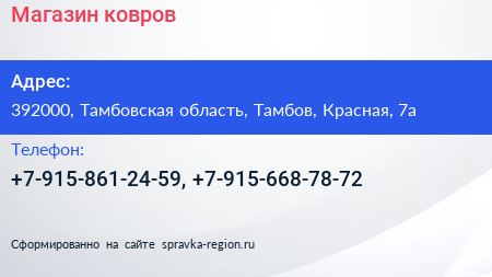 Магазин ковров по адресу 392000, Тамбовская область, Тамбов, Красная, 7а в дальнейшем Организация, размещена в следующих категориях:
