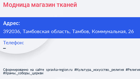 Модница, магазин тканей по адресу 392036, Тамбовская область, Тамбов, Коммунальная, 26 в дальнейшем Организация, размещена в следующих категориях:
