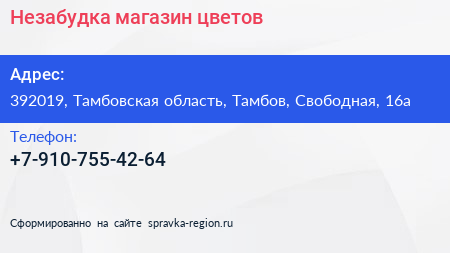 Незабудка, магазин цветов по адресу 392019, Тамбовская область, Тамбов, Свободная, 16а в дальнейшем Организация, размещена в следующих категориях: