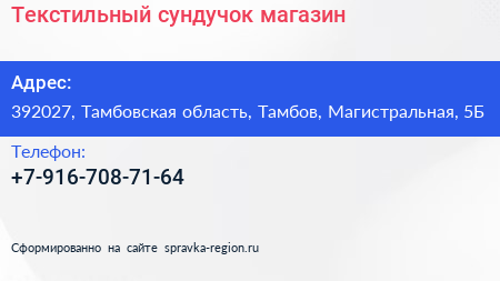 Текстильный сундучок, магазин по адресу 392027, Тамбовская область, Тамбов, Магистральная, 5Б в дальнейшем Организация, размещена в следующих категориях: