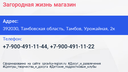 Загородная жизнь, магазин по адресу 392030, Тамбовская область, Тамбов, Урожайная, 2к в дальнейшем Организация, размещена в следующих категориях: