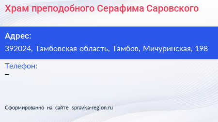 Храм преподобного Серафима Саровского по адресу 392024, Тамбовская область, Тамбов, Мичуринская, 198 в дальнейшем Организация, размещена в следующих категориях: