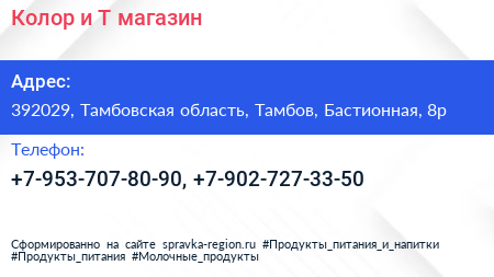 Колор и Т, магазин по адресу 392029, Тамбовская область, Тамбов, Бастионная, 8р в дальнейшем Организация, размещена в следующих категориях: