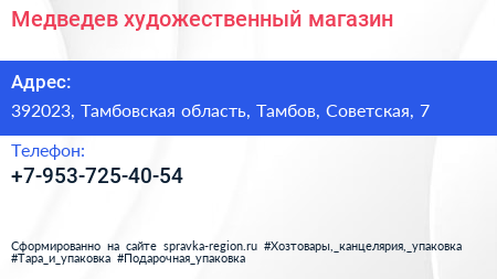 Медведев, художественный магазин по адресу 392023, Тамбовская область, Тамбов, Советская, 7 в дальнейшем Организация, размещена в следующих категориях: