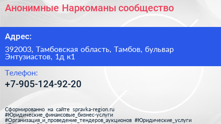 Анонимные Наркоманы, сообщество по адресу 392003, Тамбовская область, Тамбов, бульвар Энтузиастов, 1д к1 в дальнейшем Организация, размещена в следующих категориях: