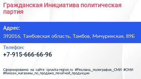 Гражданская Инициатива, политическая партия по адресу 392016, Тамбовская область, Тамбов, Мичуринская, 89Б в дальнейшем Организация, размещена в следующих категориях: