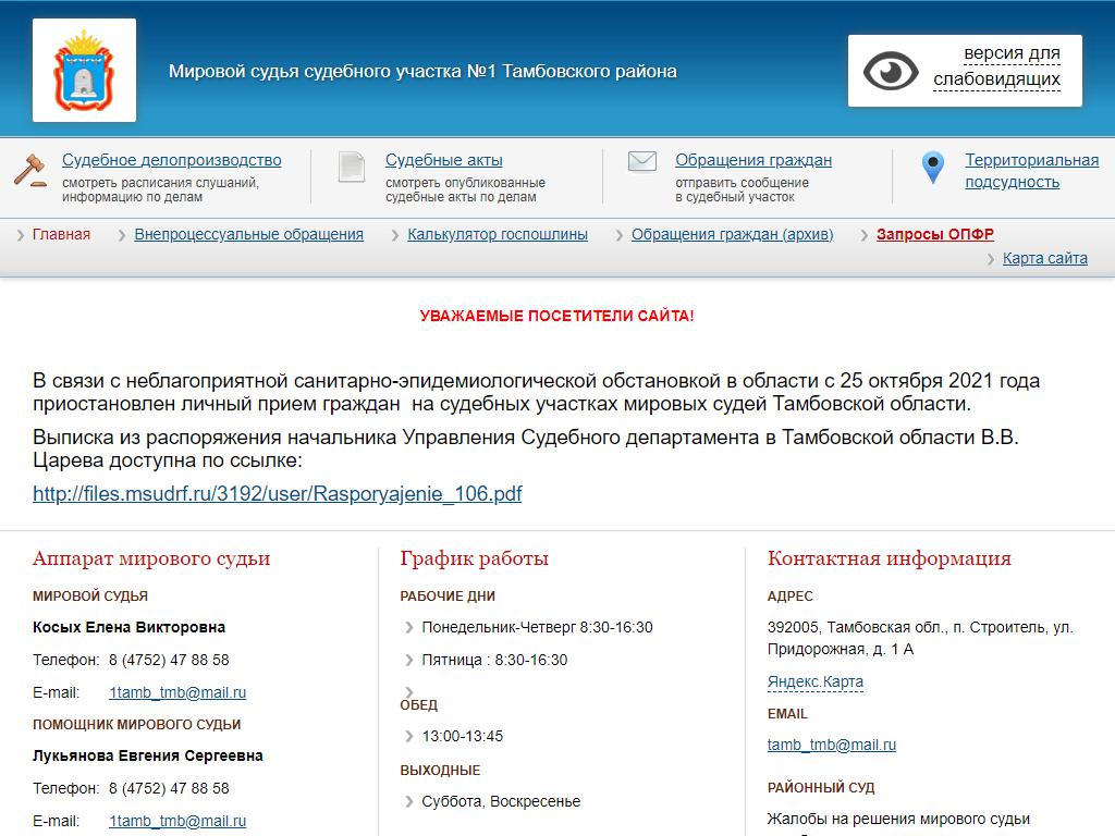 Мировые судьи Тамбовского района Тамбовской области по адресу 392005, Тамбовская область, Тамбов, Придорожная, 1а в дальнейшем Организация, размещена в следующих категориях: