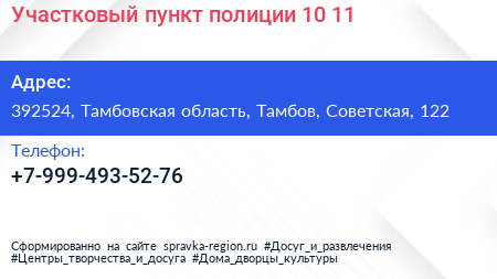 Участковый пункт полиции №10-11 по адресу 392524, Тамбовская область, Тамбов, Советская, 122 в дальнейшем Организация, размещена в следующих категориях: