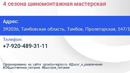 4 сезона, шиномонтажная мастерская по адресу 392036, Тамбовская область, Тамбов, Пролетарская, 147/1 в дальнейшем Организация, размещена в следующих категориях: