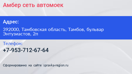 Амбер, сеть автомоек по адресу 392000, Тамбовская область, Тамбов, бульвар Энтузиастов, 2п в дальнейшем Организация, размещена в следующих категориях: