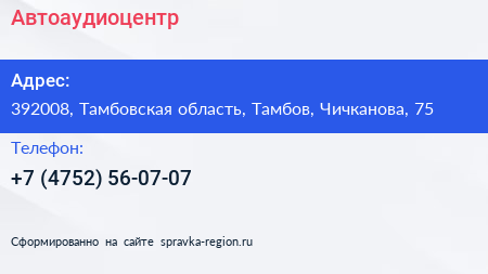 Автоаудиоцентр по адресу 392008, Тамбовская область, Тамбов, Чичканова, 75 в дальнейшем Организация, размещена в следующих категориях: