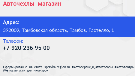 Авточехлы+, магазин по адресу 392009, Тамбовская область, Тамбов, Гастелло, 1 в дальнейшем Организация, размещена в следующих категориях: