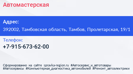 Автомастерская по адресу 392002, Тамбовская область, Тамбов, Пролетарская, 19/1 в дальнейшем Организация, размещена в следующих категориях: