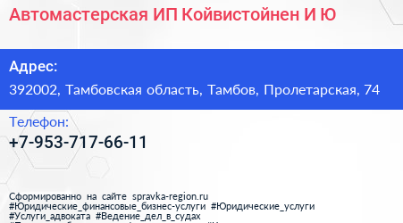 Автомастерская, ИП Койвистойнен И.Ю. по адресу 392002, Тамбовская область, Тамбов, Пролетарская, 74 в дальнейшем Организация, размещена в следующих категориях: