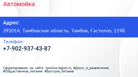 Автомойка по адресу 392014, Тамбовская область, Тамбов, Гастелло, 119Б в дальнейшем Организация, размещена в следующих категориях: