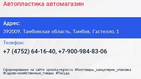 Автопластика, автомагазин по адресу 392009, Тамбовская область, Тамбов, Гастелло, 1 в дальнейшем Организация, размещена в следующих категориях: