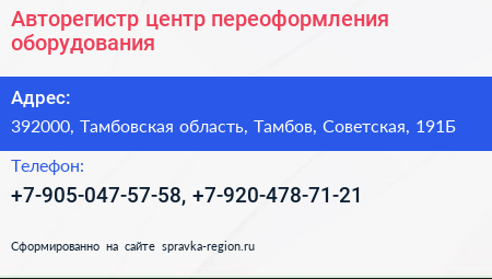 Авторегистр, центр переоформления оборудования по адресу 392000, Тамбовская область, Тамбов, Советская, 191Б в дальнейшем Организация, размещена в следующих категориях: