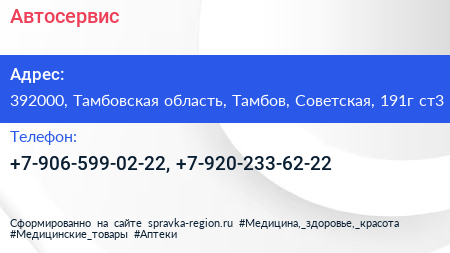 Автосервис по адресу 392000, Тамбовская область, Тамбов, Советская, 191г ст3 в дальнейшем Организация, размещена в следующих категориях: