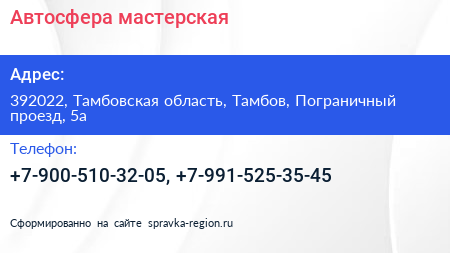 Автосфера, мастерская по адресу 392022, Тамбовская область, Тамбов, Пограничный проезд, 5а в дальнейшем Организация, размещена в следующих категориях: