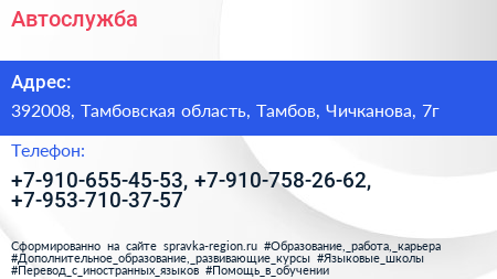Автослужба по адресу 392008, Тамбовская область, Тамбов, Чичканова, 7г в дальнейшем Организация, размещена в следующих категориях: