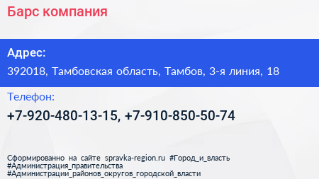 Барс, компания по адресу 392018, Тамбовская область, Тамбов, 3-я линия, 18 в дальнейшем Организация, размещена в следующих категориях:
