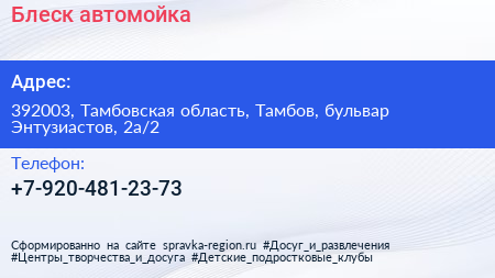 Блеск, автомойка по адресу 392003, Тамбовская область, Тамбов, бульвар Энтузиастов, 2а/2 в дальнейшем Организация, размещена в следующих категориях: