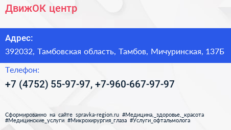 ДвижОК, центр по адресу 392032, Тамбовская область, Тамбов, Мичуринская, 137Б в дальнейшем Организация, размещена в следующих категориях: